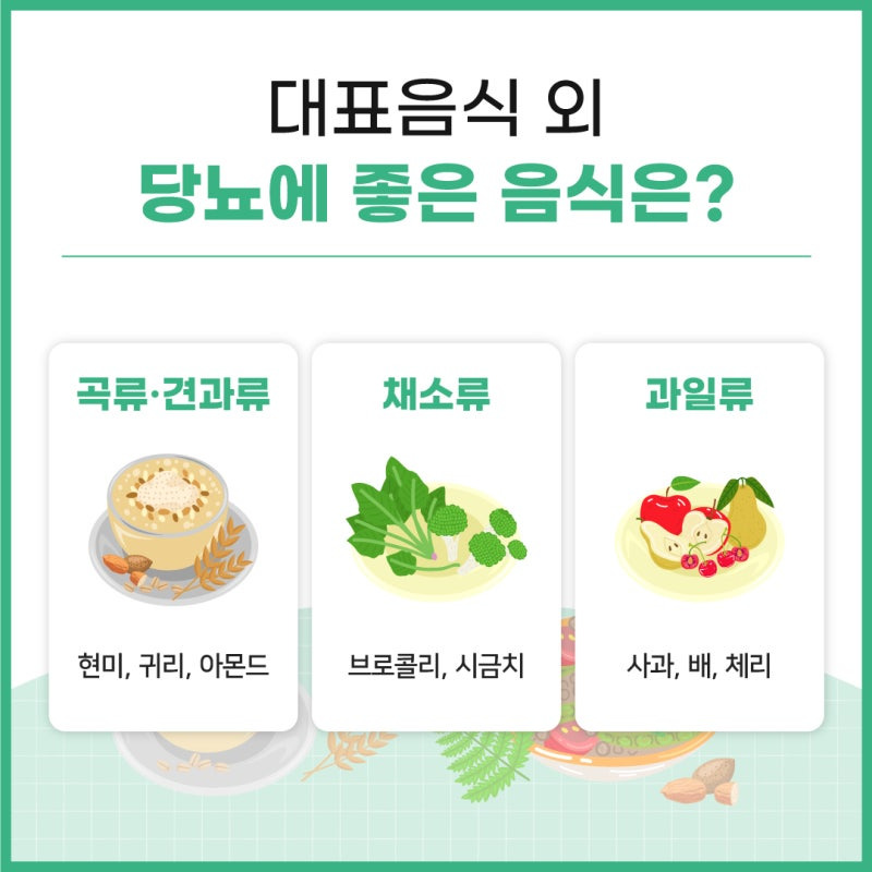 당뇨 관리를 위해서는 위의 음식들 외에도 식이섬유가 풍부한 채소와 과일을 섭취하는 것이 중요합니다. 양배추, 당근, 브로콜리 등은 식후 혈당 상승을 억제하는 데 도움을 줍니다.