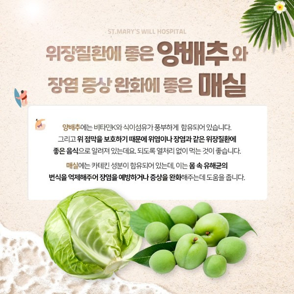 양배추는 샐러드로 먹어도 좋고, 찌거나 볶아서 먹어도 맛있어요. 샐러드로 먹을 땐 드레싱을 가볍게 뿌려서 먹으면 더 맛있어요! 또, 양배추를 국물로 끓여서 먹으면 따뜻하게 먹을 수 있어서 위장에 부담도 없고 소화도 잘 된답니다. 그리고 양배추즙도 좋은데, 너무 차갑지 않게 마시면 장염 회복에 정말 좋아요!